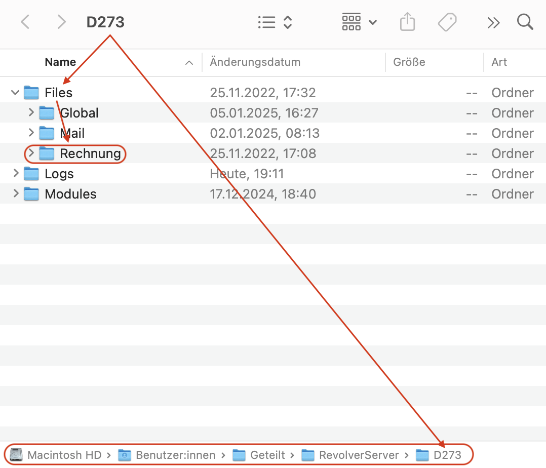 - Prüfen Sie, ob sich unter /Users/Shared/RevolverServer/D273/Files ein Ordner Rechnung befindet. Wenn nicht muss an der Stelle der Ordner erstellt werden. Dort legt Revolver die E-Rechnungen ab. Diese werden dann automatisch mit den automatischen Daten Sicherungen mitgesichert.