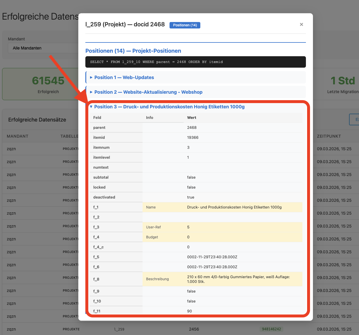 Die Fehleranalyse wurde verbessert: Positionen von Rechnungen und Projekten lassen sich nun direkt per Klick einsehen. Das erleichtert die gezielte Prüfung und Analyse im Migrationsprozess.