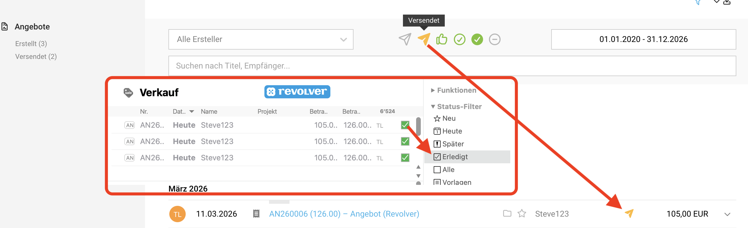 Bei migrierten Rechnungen und Angeboten wird nun zusätzlich die Gesamtsumme im Titel angezeigt. Beispiel: RE260007 (11,90) – Rechnung (Revolver). Das erleichtert die schnelle Übersicht.