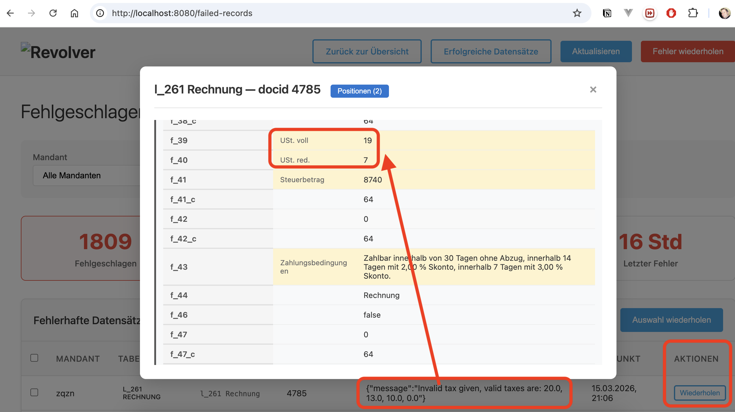 Mit einem Klick auf die Fehlermeldung kann man sich die Steuersätze dieser Rechnung ansehen.